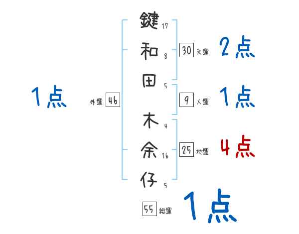 天運![]() | 鍵和田木余仔さんの天運は30画の2つ星!浮き沈みの激しさに注意しましょう。 家系が持つ宿命的な運勢を表します。祖先から受け継いだ苗字ですので自分の力が及びません。家柄を象徴します。 |