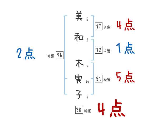 外運![]() | 美和木実子さんの外運は26画の2つ星!波瀾万丈かも。信頼できる人を大事にしましょう。 生活面を象徴する運勢です。外部から受ける影響力を表し、結婚運、家庭運や職場、環境への順応性を表します。 |