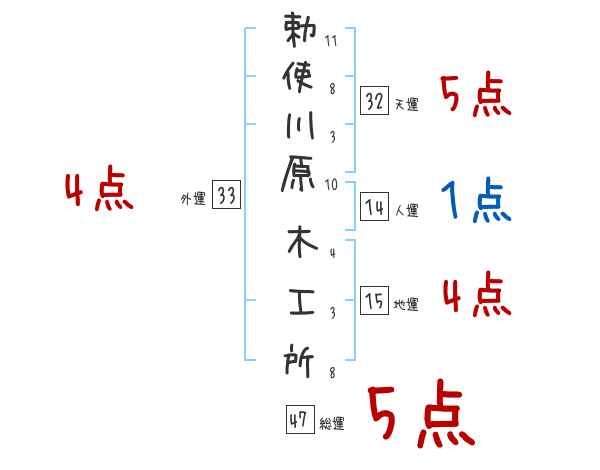 天運![]() | 勅使川原木工所さんの天運は32画の5つ星!柔軟性があり成功する。チャンスが多く金運が良い。 家系が持つ宿命的な運勢を表します。祖先から受け継いだ苗字ですので自分の力が及びません。家柄を象徴します。 |