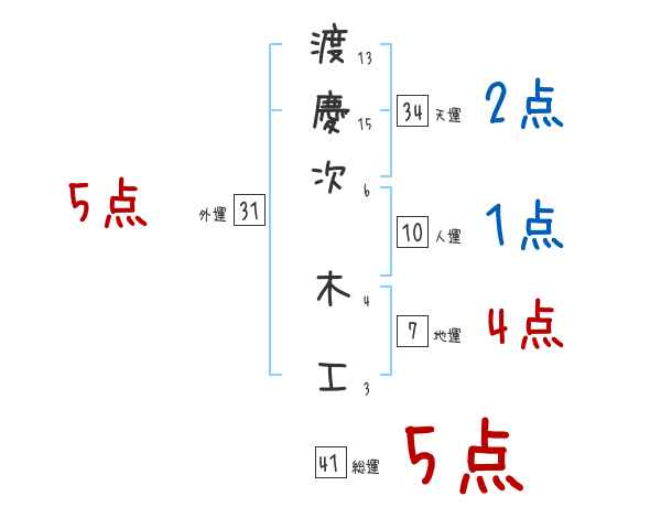 地運![]() | 渡慶次木工さんの地運は7画の4つ星!強い意志や信念を持ち独立心が強い。自立する。 個性を表す基礎的な運勢です。性格形成や対人関係、行動力など家庭環境に影響されます。主に誕生してから20歳くらいまでの若年期の運勢を表します。 |