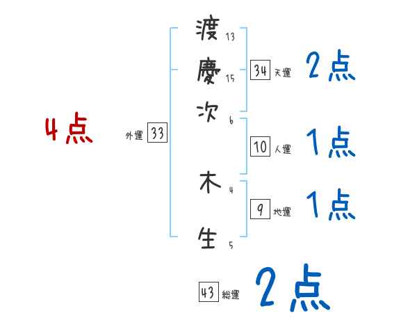 天運![]() | 渡慶次木生さんの天運は34画の2つ星!独創性に優れるが、自尊心が強く災難に注意しましょう。 家系が持つ宿命的な運勢を表します。祖先から受け継いだ苗字ですので自分の力が及びません。家柄を象徴します。 |