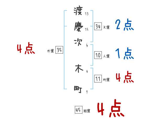 天運![]() | 渡慶次木町さんの天運は34画の2つ星!独創性に優れるが、自尊心が強く災難に注意しましょう。 家系が持つ宿命的な運勢を表します。祖先から受け継いだ苗字ですので自分の力が及びません。家柄を象徴します。 |