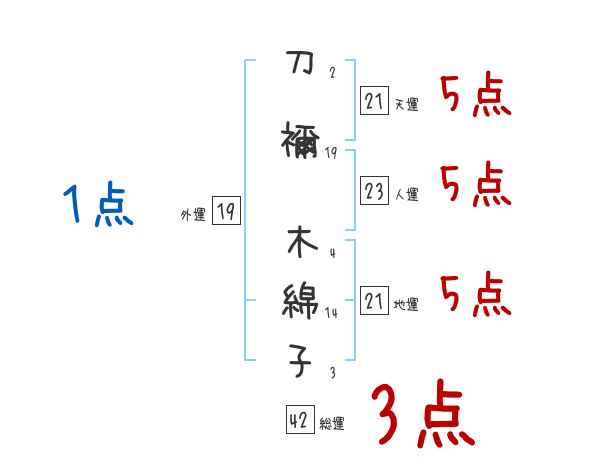 総運![]() | 刀禰木綿子さんの総運は42画の3つ星!病気に注意。多芸であるが消極的でおとなしい。 あなたの人生を表す1番重要な運勢です。生涯を通じて影響する総合運となり、主に50歳以降の晩年期に影響を及ぼします。 |