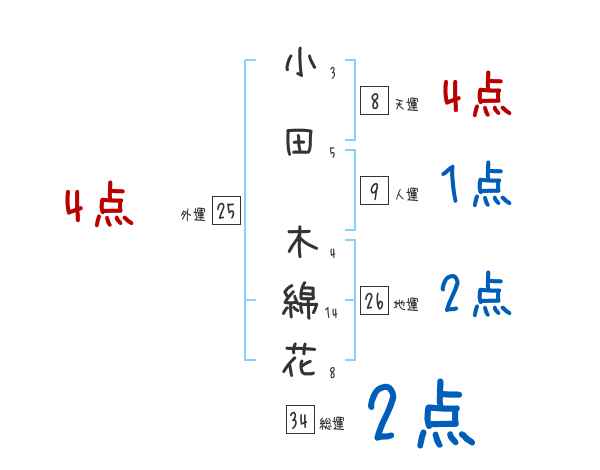 | 総運  | 小田木綿花さんの総運は34画の2つ星!独創性に優れるが、自尊心が強く災難に注意しましょう。あなたの人生を表す1番重要な運勢です。生涯を通じて影響する総合運となり、主に50歳以降の晩年期に影響を及ぼします。 |