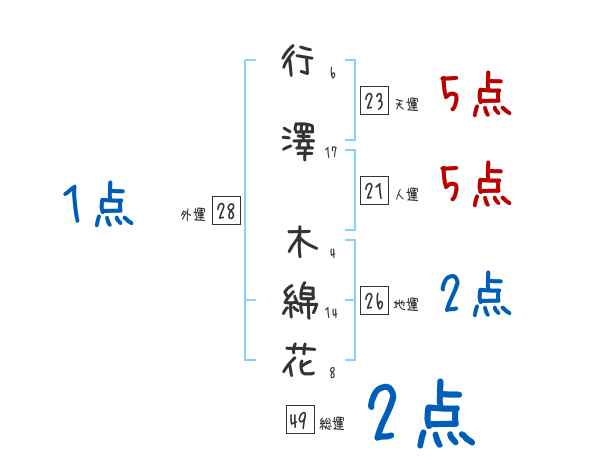 天運![]() | 行澤木綿花さんの天運は23画の5つ星!想像力に優れ活力がある。一代で成功し名誉を手に入れる。 家系が持つ宿命的な運勢を表します。祖先から受け継いだ苗字ですので自分の力が及びません。家柄を象徴します。 |