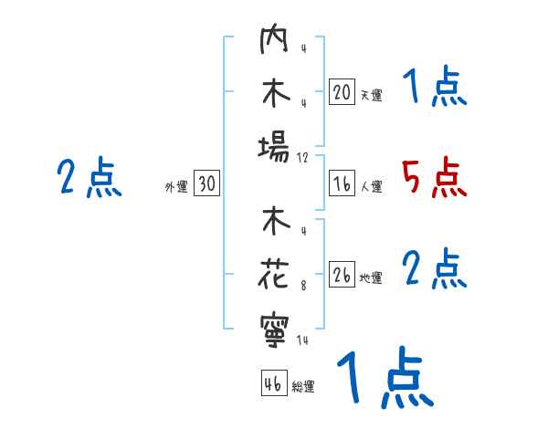 人運![]() | 内木場木花寧さんの人運は16画の5つ星!人望が厚く大きく発展する。逆転成功が見える。 性格や才能などを表す2番目に重要な運勢です。人間関係や協調性、社会的な成功に影響します。主に20歳から50歳ぐらいまでの中年期の運勢を表します。 |