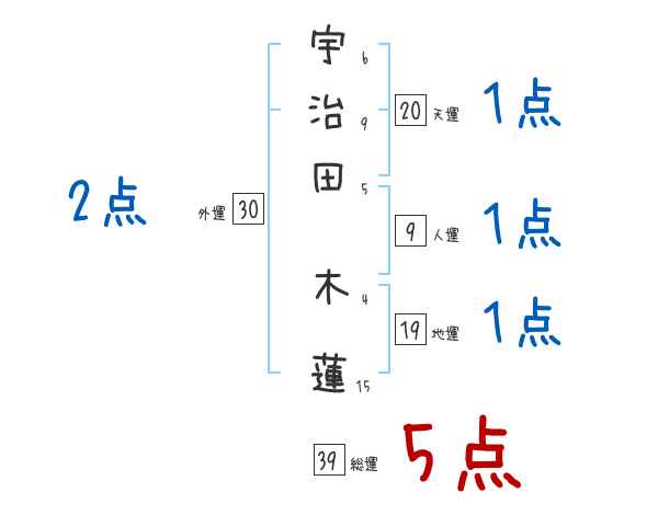 総運![]() | 宇治田木蓮さんの総運は39画の5つ星!社交性に優れ人望が厚い。人の上に立ち成功する。 あなたの人生を表す1番重要な運勢です。生涯を通じて影響する総合運となり、主に50歳以降の晩年期に影響を及ぼします。 |