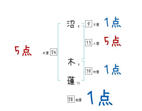総運![]() | 沼木蓮さんの総運は28画の1つ星!家庭環境に注意。スポーツで活躍できる能力があるかも。 あなたの人生を表す1番重要な運勢です。生涯を通じて影響する総合運となり、主に50歳以降の晩年期に影響を及ぼします。 |
