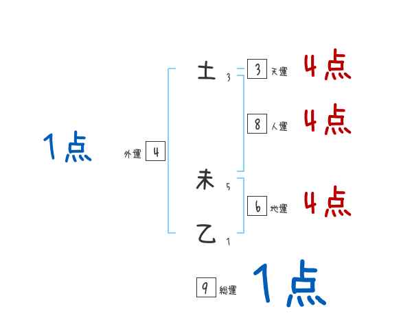 天運![]() | 土未乙さんの天運は3画の4つ星!活動的で才能に恵まれ、多くの信頼を得る。希望に満ち成長する。 家系が持つ宿命的な運勢を表します。祖先から受け継いだ苗字ですので自分の力が及びません。家柄を象徴します。 |