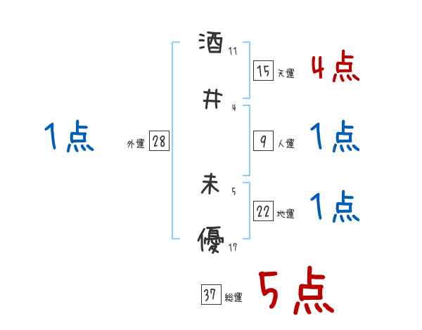 外運![]() | 酒井未優さんの外運は28画の1つ星!家庭環境に注意。スポーツで活躍できる能力があるかも。 生活面を象徴する運勢です。外部から受ける影響力を表し、結婚運、家庭運や職場、環境への順応性を表します。 |
