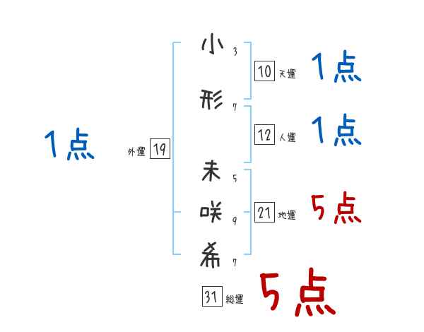 外運![]() | 小形未咲希さんの外運は19画の1つ星!優れた才能を持ちますが、協調性が足りないことも。周りの人と協力する事を意識しましょう。 生活面を象徴する運勢です。外部から受ける影響力を表し、結婚運、家庭運や職場、環境への順応性を表します。 |