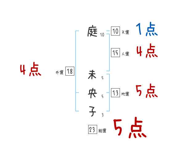 人運![]() | 庭未央子さんの人運は15画の4つ星!人徳があり出世する。順調に物事を進め円満な人生。 性格や才能などを表す2番目に重要な運勢です。人間関係や協調性、社会的な成功に影響します。主に20歳から50歳ぐらいまでの中年期の運勢を表します。 |
