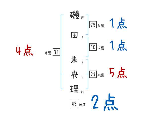 外運![]() | 磯田未央理さんの外運は33画の4つ星!権力志向でプライドが高い。勇気があり運を切り開き成功する。 生活面を象徴する運勢です。外部から受ける影響力を表し、結婚運、家庭運や職場、環境への順応性を表します。 |