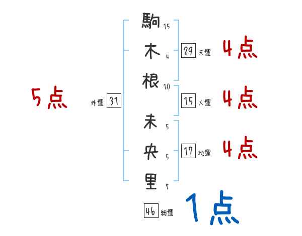 総運![]() | 駒木根未央里さんの総運は46画の1つ星!迷走することが多く苦労するかも。目先のことにとらわれないように。 あなたの人生を表す1番重要な運勢です。生涯を通じて影響する総合運となり、主に50歳以降の晩年期に影響を及ぼします。 |