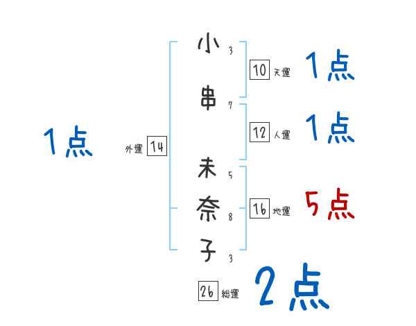 外運![]() | 小串未奈子さんの外運は14画の1つ星!人に対して優しいがストレスを溜め込みがち。人間関係のトラブルを避けるよう気をつけましょう。 生活面を象徴する運勢です。外部から受ける影響力を表し、結婚運、家庭運や職場、環境への順応性を表します。 |