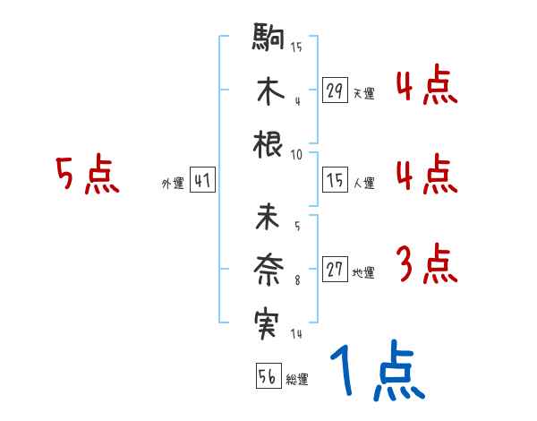 総運![]() | 駒木根未奈実さんの総運は56画の1つ星!消極的で無気力になりがち。誠実な気持ちが必要でしょう。 あなたの人生を表す1番重要な運勢です。生涯を通じて影響する総合運となり、主に50歳以降の晩年期に影響を及ぼします。 |