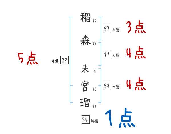 外運![]() | 稲森未宮瑠さんの外運は39画の5つ星!社交性に優れ人望が厚い。人の上に立ち成功する。 生活面を象徴する運勢です。外部から受ける影響力を表し、結婚運、家庭運や職場、環境への順応性を表します。 |