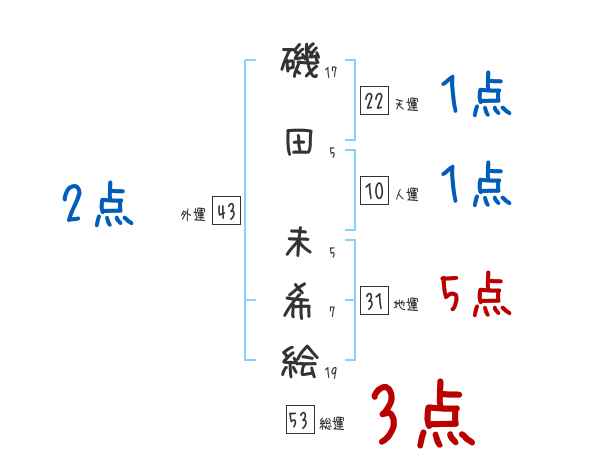 外運![]() | 磯田未希絵さんの外運は43画の2つ星!頑固な性格で独立心が強いかも。やや非現実的で浪費に注意しましょう。 生活面を象徴する運勢です。外部から受ける影響力を表し、結婚運、家庭運や職場、環境への順応性を表します。 |