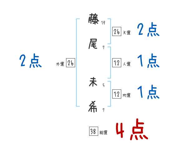 外運![]() | 藤尾未希さんの外運は26画の2つ星!波瀾万丈かも。信頼できる人を大事にしましょう。 生活面を象徴する運勢です。外部から受ける影響力を表し、結婚運、家庭運や職場、環境への順応性を表します。 |