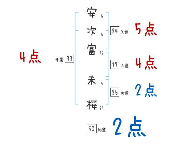 天運![]() | 安次富未桜さんの天運は24画の5つ星!家庭運が良く順調な人生。金運にも恵まれる。 家系が持つ宿命的な運勢を表します。祖先から受け継いだ苗字ですので自分の力が及びません。家柄を象徴します。 |