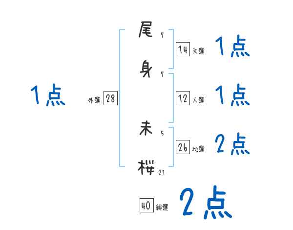 外運![]() | 尾身未桜さんの外運は28画の1つ星!家庭環境に注意。スポーツで活躍できる能力があるかも。 生活面を象徴する運勢です。外部から受ける影響力を表し、結婚運、家庭運や職場、環境への順応性を表します。 |