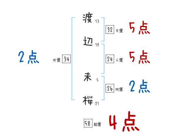 天運![]() | 渡辺未桜さんの天運は32画の5つ星!柔軟性があり成功する。チャンスが多く金運が良い。 家系が持つ宿命的な運勢を表します。祖先から受け継いだ苗字ですので自分の力が及びません。家柄を象徴します。 |