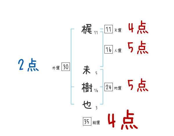 外運![]() | 梶未樹也さんの外運は30画の2つ星!浮き沈みの激しさに注意しましょう。 生活面を象徴する運勢です。外部から受ける影響力を表し、結婚運、家庭運や職場、環境への順応性を表します。 |