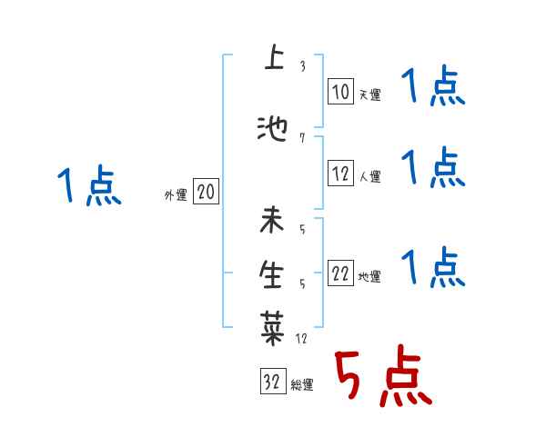 総運![]() | 上池未生菜さんの総運は32画の5つ星!柔軟性があり成功する。チャンスが多く金運が良い。 あなたの人生を表す1番重要な運勢です。生涯を通じて影響する総合運となり、主に50歳以降の晩年期に影響を及ぼします。 |