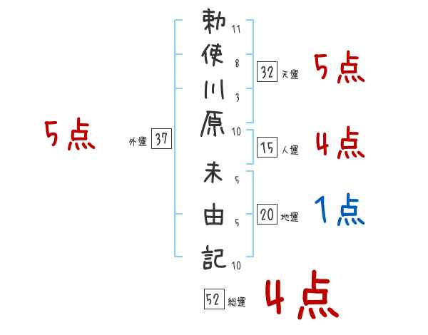 天運![]() | 勅使川原未由記さんの天運は32画の5つ星!柔軟性があり成功する。チャンスが多く金運が良い。 家系が持つ宿命的な運勢を表します。祖先から受け継いだ苗字ですので自分の力が及びません。家柄を象徴します。 |