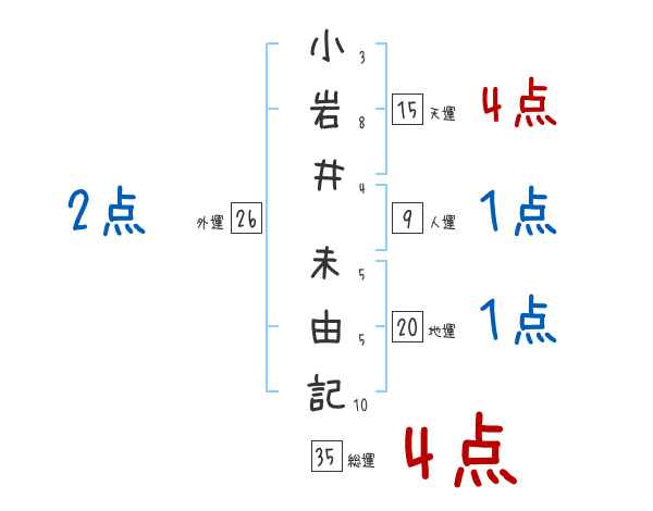外運![]() | 小岩井未由記さんの外運は26画の2つ星!波瀾万丈かも。信頼できる人を大事にしましょう。 生活面を象徴する運勢です。外部から受ける影響力を表し、結婚運、家庭運や職場、環境への順応性を表します。 |