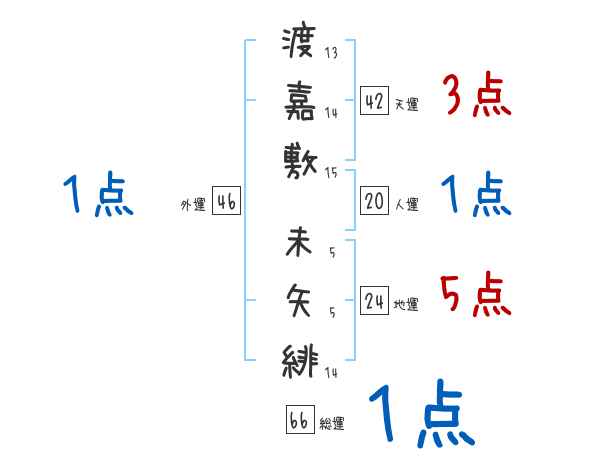 渡嘉敷未矢緋さんの画数の鑑定結果