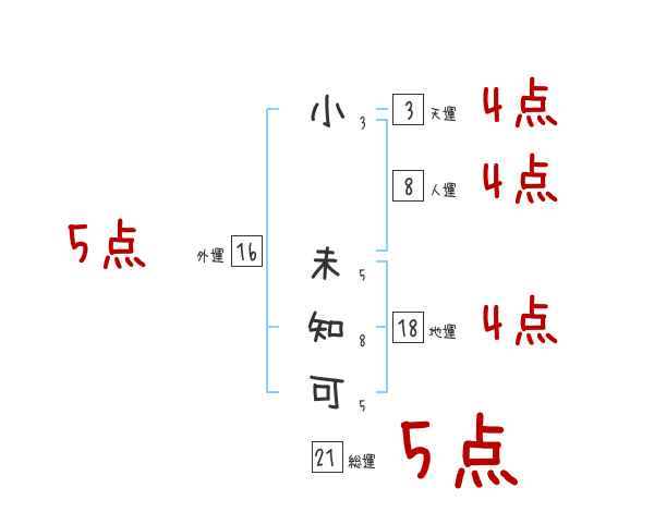 外運![]() | 小未知可さんの外運は16画の5つ星!人望が厚く大きく発展する。逆転成功が見える。 生活面を象徴する運勢です。外部から受ける影響力を表し、結婚運、家庭運や職場、環境への順応性を表します。 |