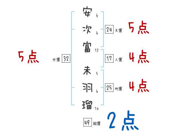 外運![]() | 安次富未羽瑠さんの外運は32画の5つ星!柔軟性があり成功する。チャンスが多く金運が良い。 生活面を象徴する運勢です。外部から受ける影響力を表し、結婚運、家庭運や職場、環境への順応性を表します。 |