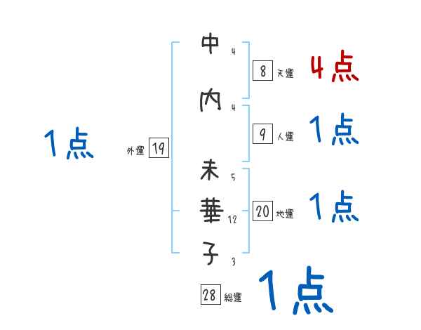 総運![]() | 中内未華子さんの総運は28画の1つ星!家庭環境に注意。スポーツで活躍できる能力があるかも。 あなたの人生を表す1番重要な運勢です。生涯を通じて影響する総合運となり、主に50歳以降の晩年期に影響を及ぼします。 |