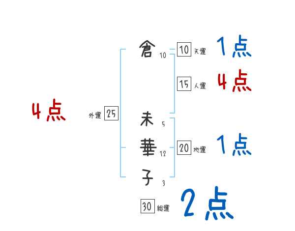 総運![]() | 倉未華子さんの総運は30画の2つ星!浮き沈みの激しさに注意しましょう。 あなたの人生を表す1番重要な運勢です。生涯を通じて影響する総合運となり、主に50歳以降の晩年期に影響を及ぼします。 |