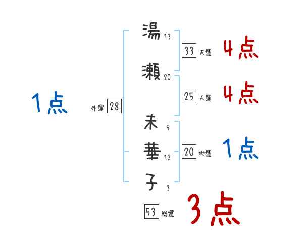 外運![]() | 湯瀬未華子さんの外運は28画の1つ星!家庭環境に注意。スポーツで活躍できる能力があるかも。 生活面を象徴する運勢です。外部から受ける影響力を表し、結婚運、家庭運や職場、環境への順応性を表します。 |