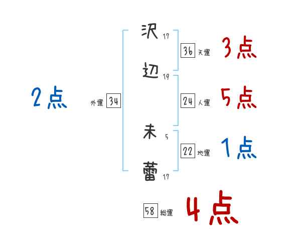 外運![]() | 沢辺未蕾さんの外運は34画の2つ星!独創性に優れるが、自尊心が強く災難に注意しましょう。 生活面を象徴する運勢です。外部から受ける影響力を表し、結婚運、家庭運や職場、環境への順応性を表します。 |