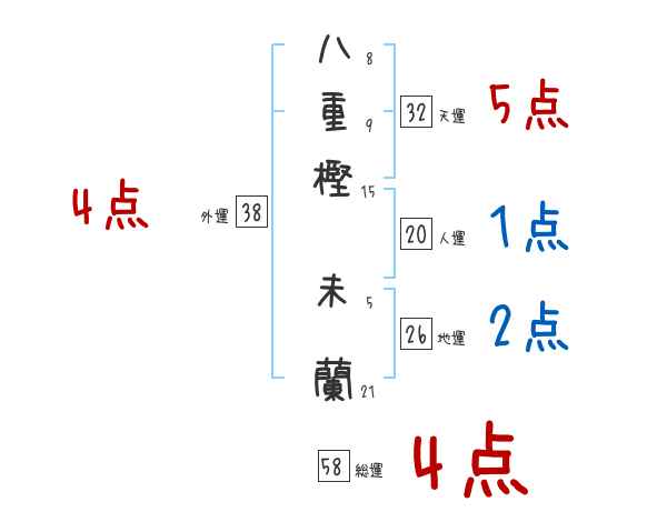 天運![]() | 八重樫未蘭さんの天運は32画の5つ星!柔軟性があり成功する。チャンスが多く金運が良い。 家系が持つ宿命的な運勢を表します。祖先から受け継いだ苗字ですので自分の力が及びません。家柄を象徴します。 |