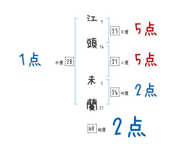 天運![]() | 江頭未蘭さんの天運は23画の5つ星!想像力に優れ活力がある。一代で成功し名誉を手に入れる。 家系が持つ宿命的な運勢を表します。祖先から受け継いだ苗字ですので自分の力が及びません。家柄を象徴します。 |