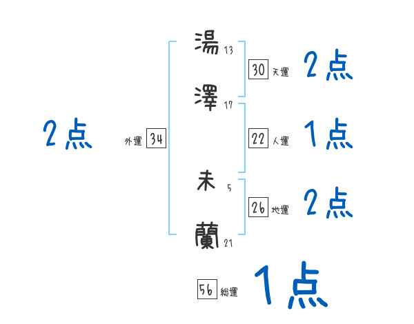 天運![]() | 湯澤未蘭さんの天運は30画の2つ星!浮き沈みの激しさに注意しましょう。 家系が持つ宿命的な運勢を表します。祖先から受け継いだ苗字ですので自分の力が及びません。家柄を象徴します。 |