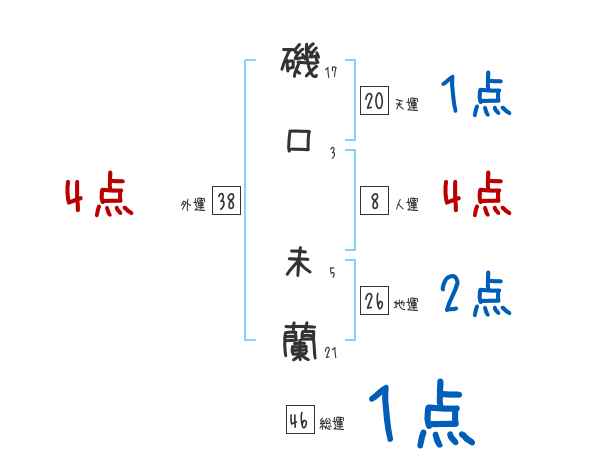 総運![]() | 磯口未蘭さんの総運は46画の1つ星!迷走することが多く苦労するかも。目先のことにとらわれないように。 あなたの人生を表す1番重要な運勢です。生涯を通じて影響する総合運となり、主に50歳以降の晩年期に影響を及ぼします。 |