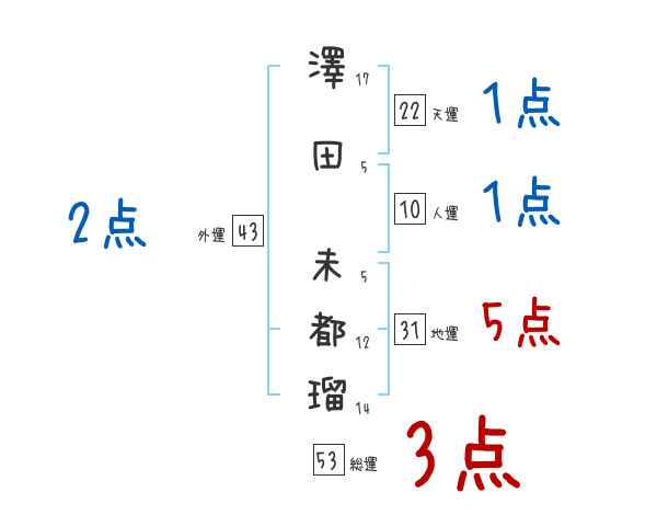 総運![]() | 澤田未都瑠さんの総運は53画の3つ星!やや見栄っ張りで虚栄心がある。散財に注意。 あなたの人生を表す1番重要な運勢です。生涯を通じて影響する総合運となり、主に50歳以降の晩年期に影響を及ぼします。 |