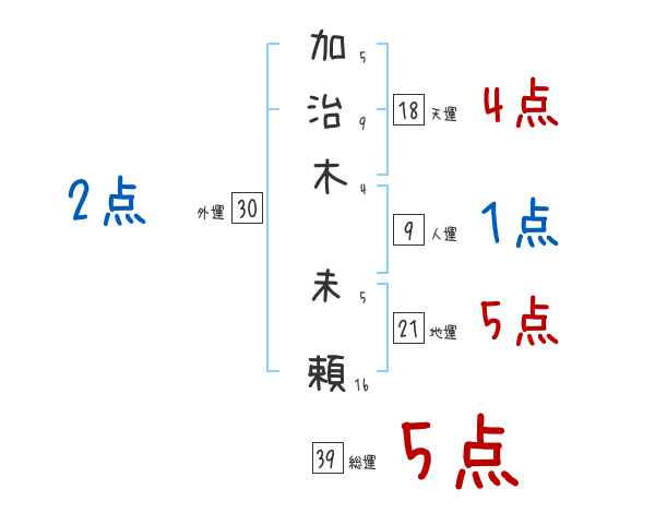 総運![]() | 加治木未頼さんの総運は39画の5つ星!社交性に優れ人望が厚い。人の上に立ち成功する。 あなたの人生を表す1番重要な運勢です。生涯を通じて影響する総合運となり、主に50歳以降の晩年期に影響を及ぼします。 |