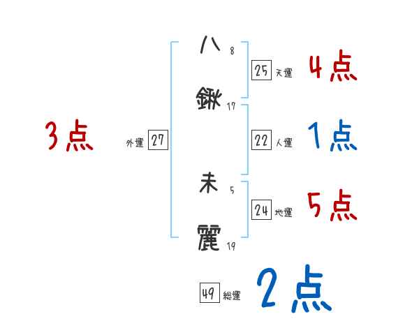 天運![]() | 八鍬未麗さんの天運は25画の4つ星!個性があり才能があふれる。強運の持ち主で発展する。 家系が持つ宿命的な運勢を表します。祖先から受け継いだ苗字ですので自分の力が及びません。家柄を象徴します。 |