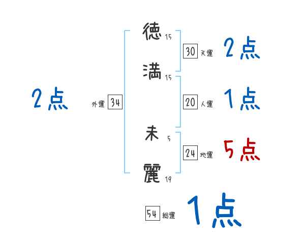 天運![]() | 徳満未麗さんの天運は30画の2つ星!浮き沈みの激しさに注意しましょう。 家系が持つ宿命的な運勢を表します。祖先から受け継いだ苗字ですので自分の力が及びません。家柄を象徴します。 |