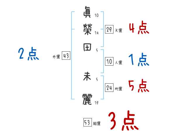 総運![]() | 眞榮田未麗さんの総運は53画の3つ星!やや見栄っ張りで虚栄心がある。散財に注意。 あなたの人生を表す1番重要な運勢です。生涯を通じて影響する総合運となり、主に50歳以降の晩年期に影響を及ぼします。 |