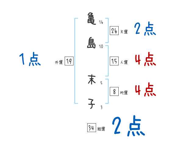 総運![]() | 亀島末子さんの総運は34画の2つ星!独創性に優れるが、自尊心が強く災難に注意しましょう。 あなたの人生を表す1番重要な運勢です。生涯を通じて影響する総合運となり、主に50歳以降の晩年期に影響を及ぼします。 |