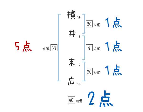 外運![]() | 横井末広さんの外運は31画の5つ星!社交性があり判断力に優れる。順風満帆な人生で円満な生活。 生活面を象徴する運勢です。外部から受ける影響力を表し、結婚運、家庭運や職場、環境への順応性を表します。 |