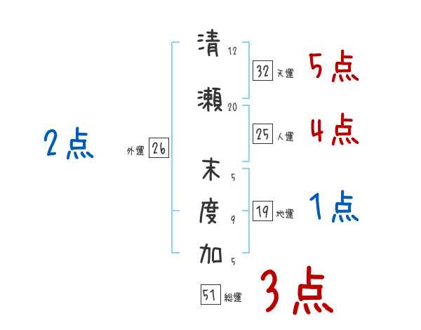 天運![]() | 清瀬末度加さんの天運は32画の5つ星!柔軟性があり成功する。チャンスが多く金運が良い。 家系が持つ宿命的な運勢を表します。祖先から受け継いだ苗字ですので自分の力が及びません。家柄を象徴します。 |