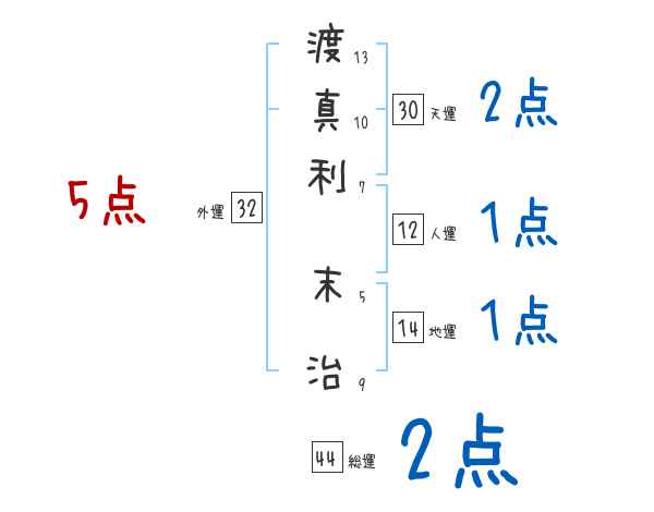 天運![]() | 渡真利末治さんの天運は30画の2つ星!浮き沈みの激しさに注意しましょう。 家系が持つ宿命的な運勢を表します。祖先から受け継いだ苗字ですので自分の力が及びません。家柄を象徴します。 |